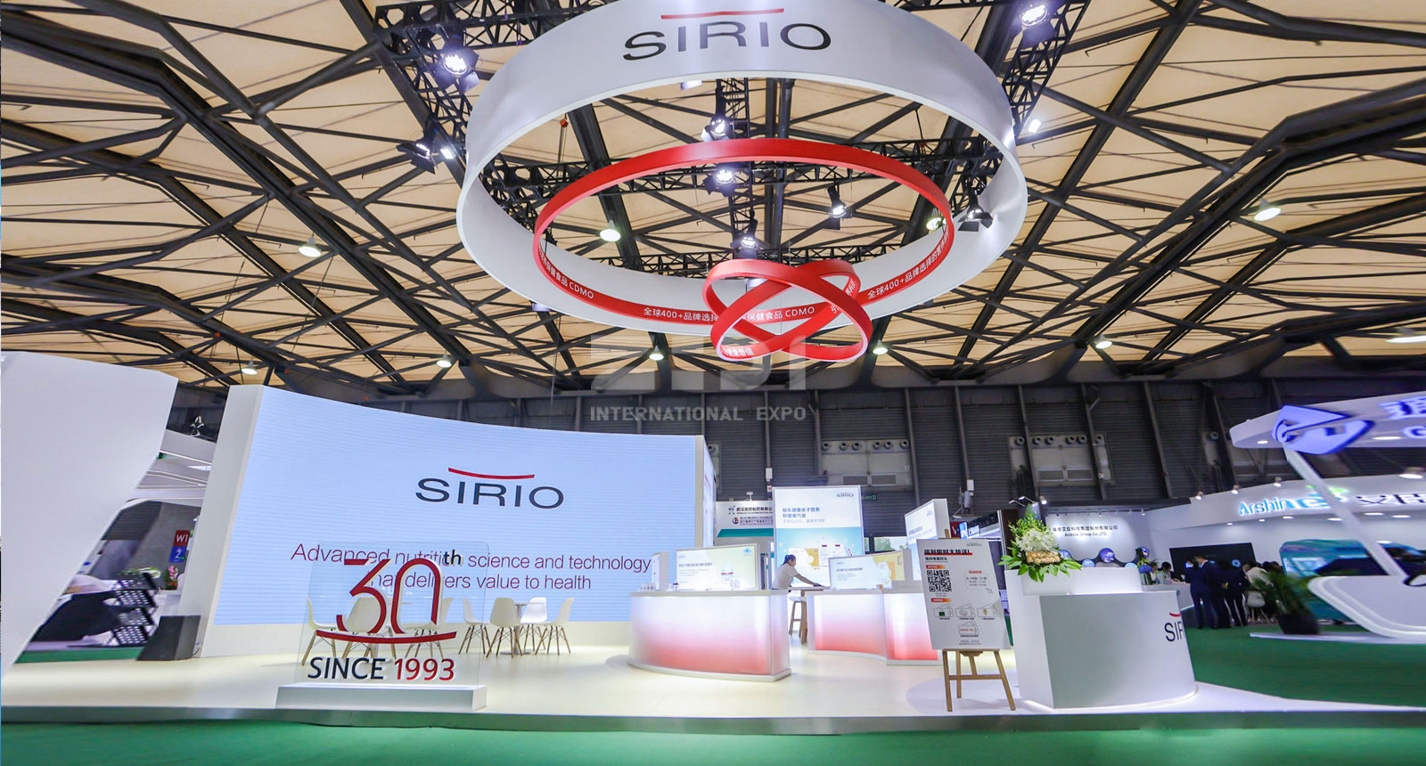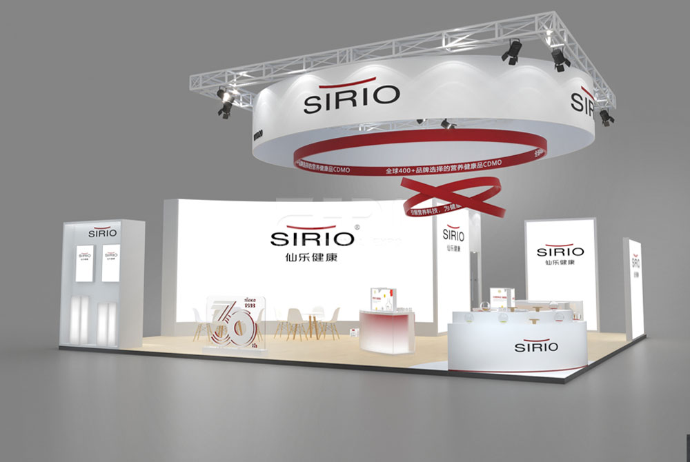 The "Sirio" booth covers an area of 132 square meters, with a predominantly white color scheme. The main structure is made of wood with a full paint finish, and the top structure is a soft membrane. The specific materials include: truss frames, 15 car show lights, fabric light boxes, acrylic lighting, tempered glass, a 10-centimeter platform with melamine board,