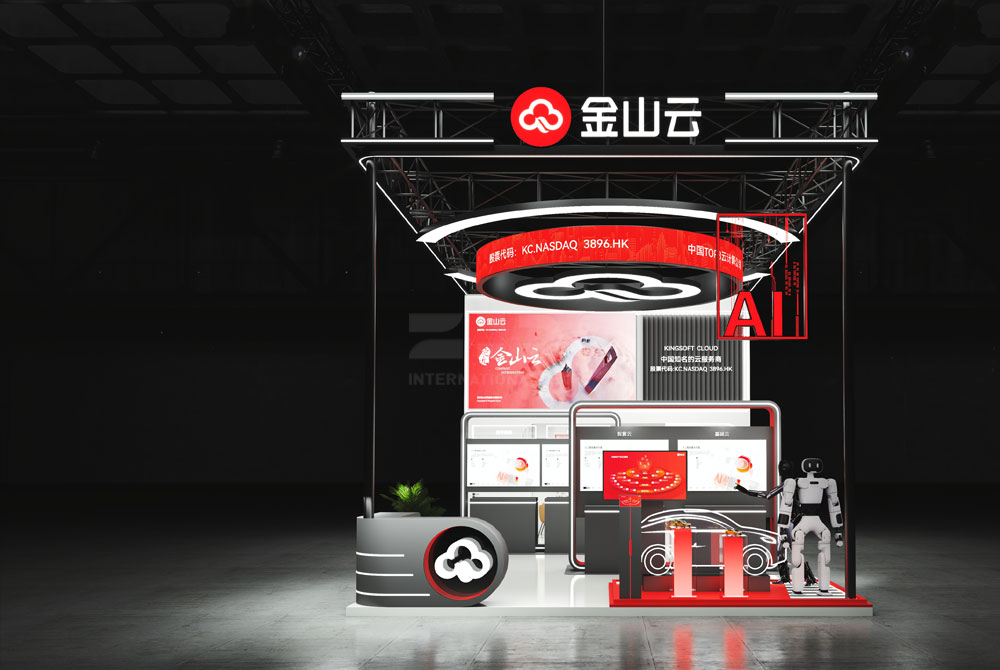 For the WAIC booth construction and layout, red and white are chosen as the theme colors, which precisely align with the positioning of a tech-style design. White, symbolizing the purity, rationality and boundless possibilities of technology, conveys the spirit of pursuing innovation and exploring the unknown in the field of artificial intelligence; red, representing vitality, enthusiasm and breakthroughs, highlights Kingsoft Cloud's proactive and trend-leading posture in the fields of cloud computing and artificial intelligence.