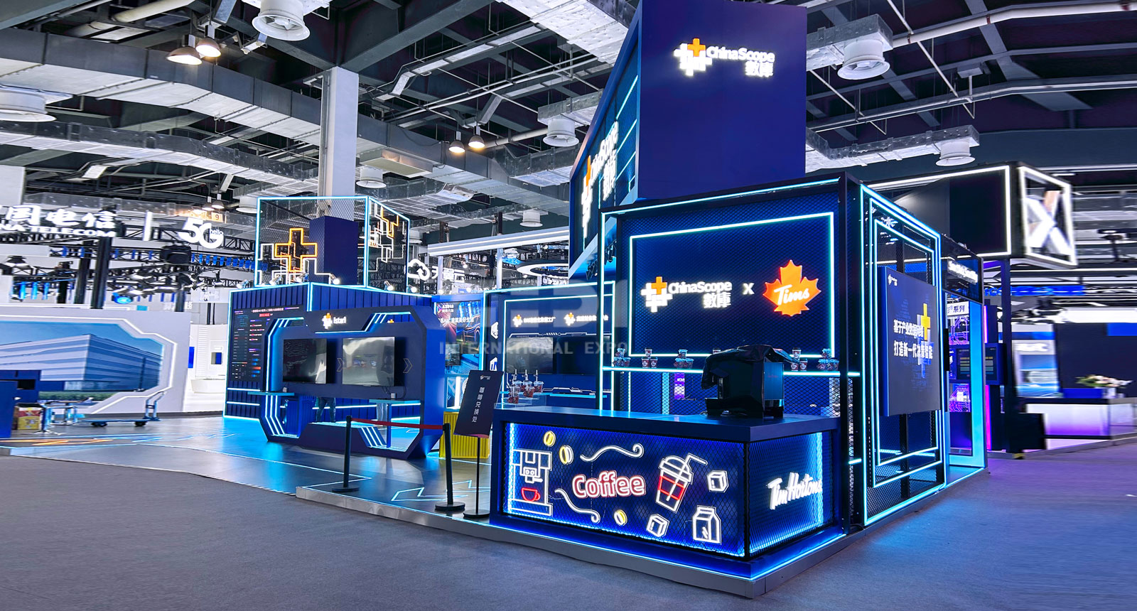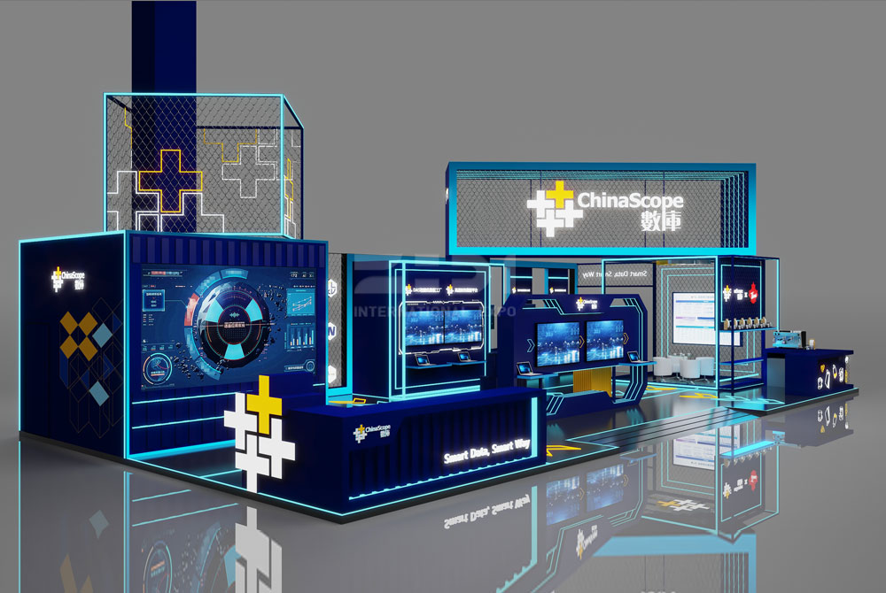 The "ChinaScope" booth covers an area of 162 square meters, featuring a modern tech style with a blue theme color. All materials used in the data exhibition booth are flame retardant with a rating of B1 or higher. The materials include: iron mesh, gradient photo prints, acrylic luminous letters, square tube welded iron art frames, iron mesh with neon light-up letters, touch screens, and double-sided soft film light boxes, among others.