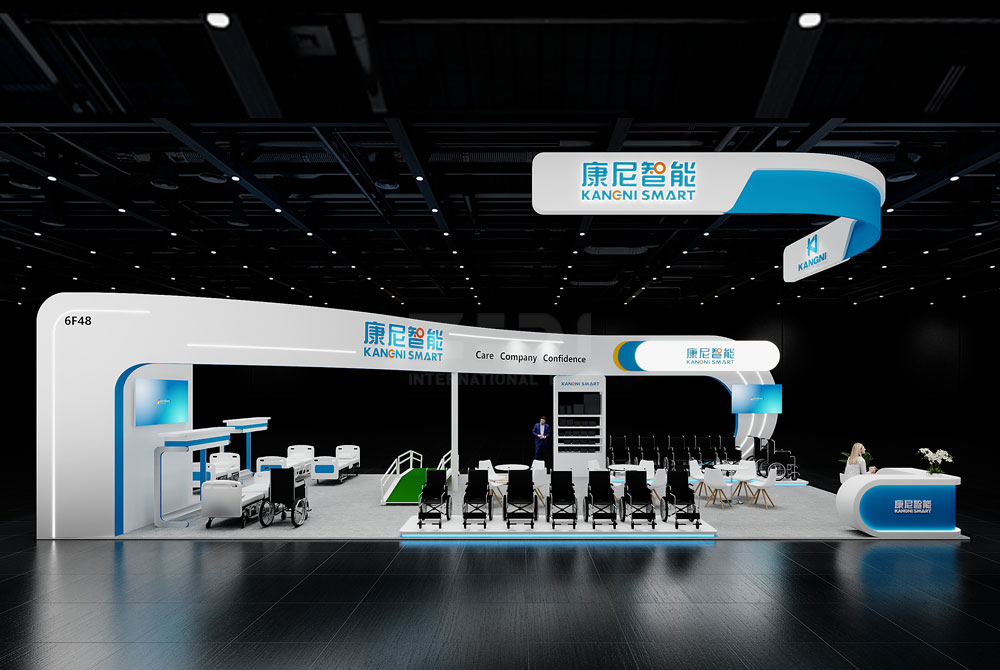 The "KANGNI SMART" booth covers an area of 112 square meters, featuring curved lines and a blue and white color scheme to highlight the high-end image of Kangni Smart. The use of wooden structures enhances the overall texture and visual effect of the booth.